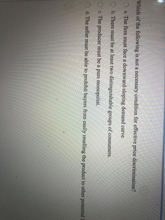 First the market must be a form of imperfect competition. In order for effective price discrimination to occur a seller must. Such monopoly power is necessary to discriminate the price.